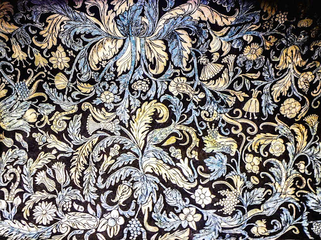 Unlike the geometric designs above the portería and upper cloister, the ceilings here complement the wall frescoes, alive with restless, acanthus like foliage with varied blossoms and clusters of grapes. In contrast to the walls, no birds or animals appear although song scrolls are everywhere.